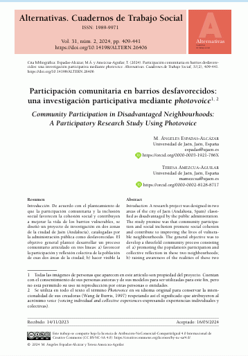 Participación comunitaria en barrios desfavorecidos: una investigación participativa mediante photovoice = Community Participation in Disadvantaged Neighbourhoods: A Participatory Research Study Using Photovoice / M. Ángeles Espadas Alcázar, Teresa Amezcua Aguilar