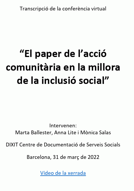 El paper de l’acció comunitària en la millora de la inclusió social : transcripció de la conferència virtual, Barcelona, 31 de març de 2022 / a càrrec de Marta Ballester, Anna Lite i Mònica Salas [Recurs electrònic]