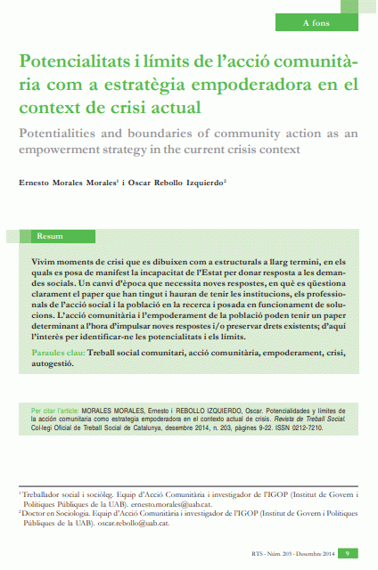 Potencialitats i límits de l'acció comunitària com a estratègia empoderadora en el context de crisi actual / Ernesto Morales Morales, Oscar Rebollo Izquierdo [Recurs electrònic]