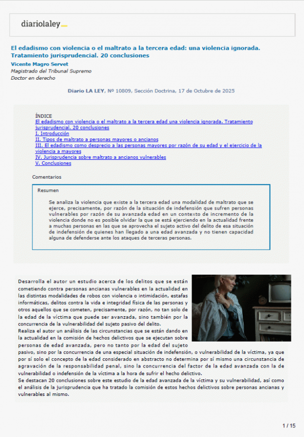 En: Diario LA LEY, Nº 10809, Sección Doctrina, 17 de Octubre de 2025Resumen: "S'analitza la violència que existeix a la tercera edat una modalitat de maltractament que s'exerceix, precisament, per raó de la situació d'indefensió que sofreixen persones vulnerables per raó de la seva avançada edat en un context d'increment de la violència on no és possible oblidar la que s'està exercint en l'actualitat enfront de moltes persones en les quals s'aprofita el subjecte actiu del delicte d'aquesta situació d'indefensió dels qui han arribat a una edat avançada i no tenen cap capacitat de defensar-se davant els atacs de terceres persones"